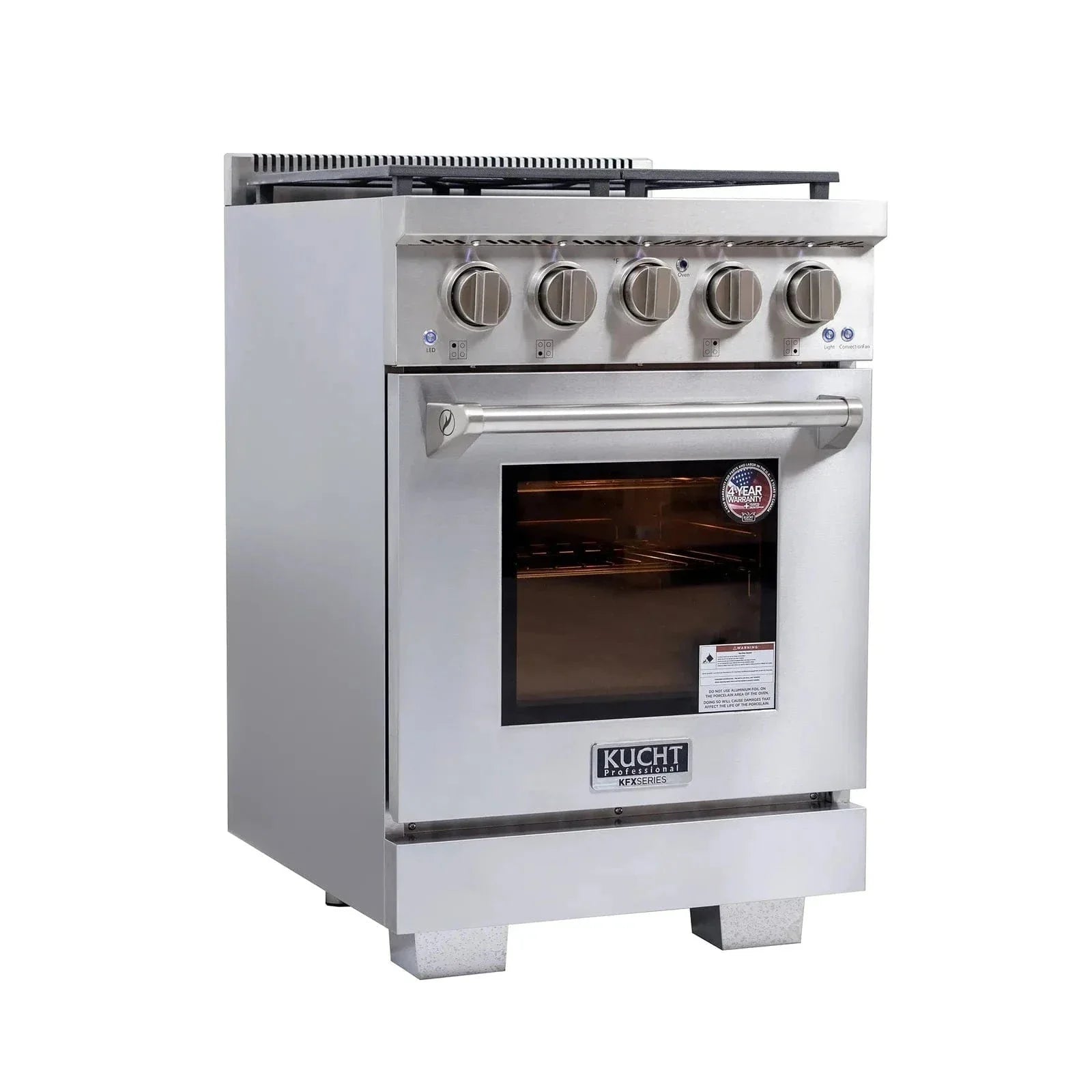 The oven is all porcelain coated, incorporating an internal convection fan assuring every corner receives steady, even, and constant heat. Thanks to this system, Kucht ranges and ovens require less baking time for foods, even allowing the home chef to work at lower temperatures than it would normally take in a conventional oven.